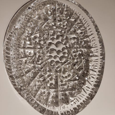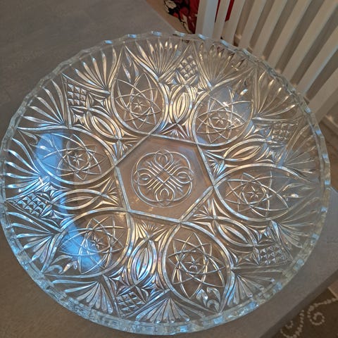 Kristallinen tarjoiluastia, lev. 28, kork. 3 cm. Täysin ehjä. Mieluiten nouto.