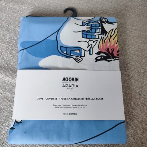 Moomin Arabian kodintekstiilin uusi pussilakanasetti 100-prosenttista puuvillaa. Pussilakanan koko 150 x 210 cm ja tyynyliinan 50 x 60 cm.