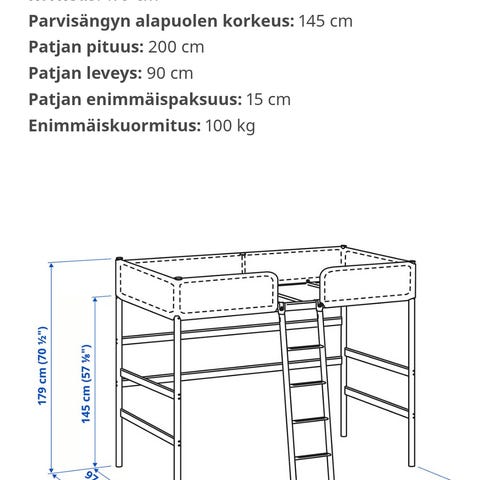 Annetaan parvisänky. Muutama pultti puuttuu, mutta jäljellä olevilla on pysynyt tukevasti pystyssä. Patja ei kuulu mukaan. Sänky osissa.
