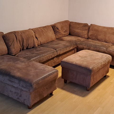 Vaalea iso kulmasohva , divaanin leveys 150cm, istuinosa 200cm, syvyys 83cm. Päälliset voi pestä. Menee kahteen osaan , vain nouto ja omat kantajat. Ermatiko.ee malli. Möysä.