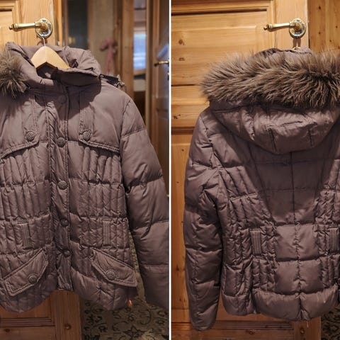 Tummanvihreä edc:n pitkä toppatakki jossa Irrotettavat huppu ja keinoturkiskarva.