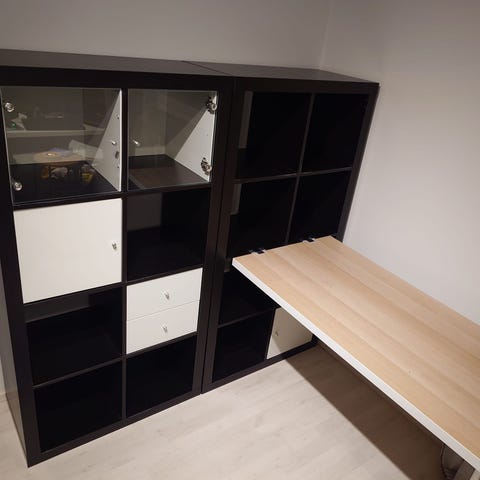 Tyylikäs, siisti 24-lokeroinen hyllykkö. Väri musta/tammi. Hyllytasot ovat irroitettavia. Lokerikot ovat samankokoisia kuin Kallax -hyllykössä, joten voit käyttää siihen sopia koreja. Vierekkäin on kaksi moduulia. Oikeassa alareunassa johdoille aukko.