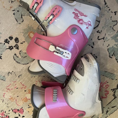 Atomic Hawk Jr laskettelumonot tytöille. Värit vaaleanharmaa ja pinkki. Monot on varustettu säädettävillä soljilla ja pehmustetulla sisävuorella.