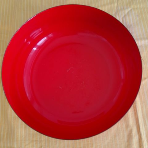 Arabia finel sydänkulho, jossa on punaiset sydänkuviot. Kulho on valkoista materiaalia ja sen halkaisija on noin 21 cm. Käytetty astia, jossa näkyy käyttöjälkiä.