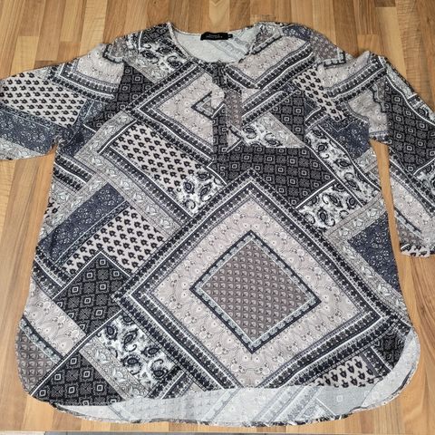 Musta (mustempi kuin kuvassa) lyhyt hihainen paitapusero. Siisti. Kainalo-kainalo mitta n. 60 cm. Olka-helma n. 70 cm. Hihan suun ympärys n. 45 cm.