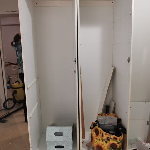 Peiliovellinen kaappi, ei mikään priima, mutta ihan toimiva ja ehjä kuitenkin. Puretaan valmiiksi. Nouto Leinolasta.