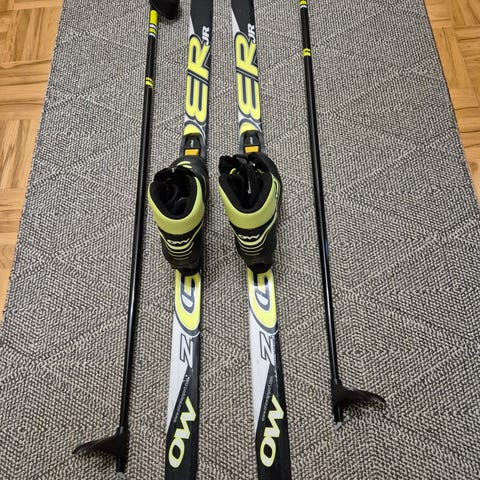 Fischer Sprint Crown hiihtosukset pitopohjalla, pituus 120 cm. Värit musta ja keltainen. Sopii perinteiseen hiihtotyyliin. Monot koko 31, sauvat 100cm.