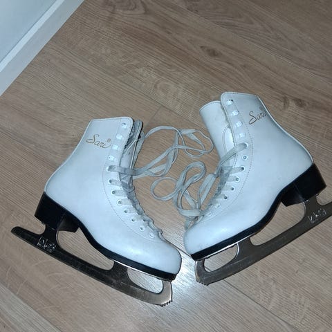 Spin lasten luistimet, koko 35, valkoinen väri. Luistimissa käytön jälkiä (pinnassa naarmuja/jälkiä), mutta ovat vain kosmeettinen haitta. Luistimet ovat ehjät. Nouto Oulu Mäntylä.