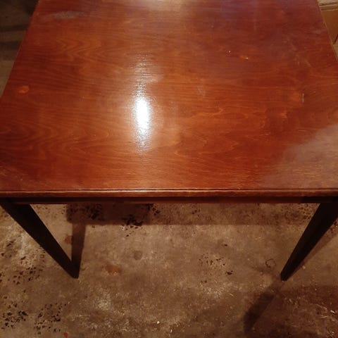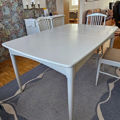 Vintagetuolit ja pöytä -90-luvulta. Merkistä ei varmaa tietoa (sanottu pyramid-mallia ja että alkuperäinen hinta ollut tuoli+pöytä-setille 1000€). Tuolit kuitenkin laadukasta materiaalia ja kolmijalkaiseksi tuoliksi tukeva. Tuoleissa on iän tuomaa kulutusta ja jalat vaatii pientä kiristystä, minkä jätän ostajan hommaksi. Ruokapöydässä pientä kulumaa myös.