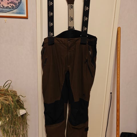 Housuissa on useita taskuja ja säädettävät lahkeet. Pieni reikä toisessa lahkeessa, muuten ehjät.