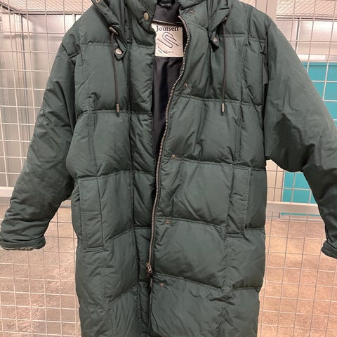 Käytössä ollut ei kovin paksu untuvatakki irrotettavalla turkisreunuksella. Naisellinen istuva malli, pituus noin polveen saakka. Toinen vyölenkeistä irronnut.