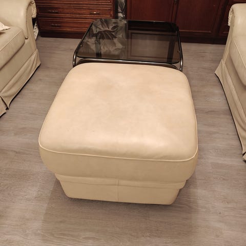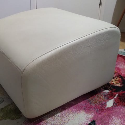 Hyvässä kunnossa oleva nahkarahi( luonnonvalkoinen) Mitat 55x55x40cm. Korkeus on 40+ jalkojen korkeus. Ei mitään näkyviä vikoja ja täysin ehjä. Iskun mallistoa.