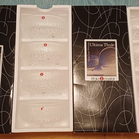 Myydään käyttämättömät uudenveroiset Iittala Ultima Thule kulhot omissa pakkauksissaan. Halkaisija n. 15cm ja korkeus 10cm.