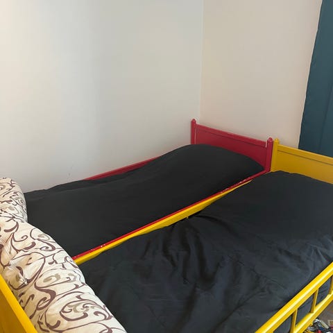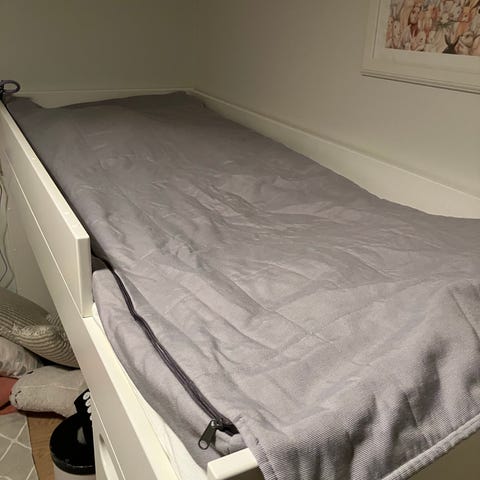 Helposti lapsenkin itse pedattava päiväpeitto, jossa vetoketjut molemmilla puolilla. Teetetty mittatilauksena 90x200 sänkyyn. Sopii parhaiten max. 15cm paksulle patjalle. Harmaa kuosi ruututikkauksin, valkoinen vetoketju.