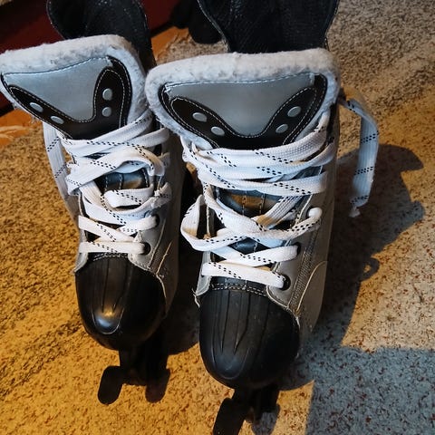 Kolme paria luistimia, koot ei näkyvillä.kokeilemalla selviää.3kpl kypäriä mukaan.standardi kokoa.