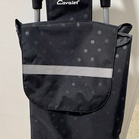 Cavalet ostoskärry kerran käytetty kesällä, ei ollutkaan tarvetta sille. Ostin sen uutena, vetoketju tasku on iso toinen tasku on 17 cm korkea. Sivun verkkotaskuun sopii hyvin, vaikka sateenvarjo ☔. Pyörät ovat 17 cm korkeat.