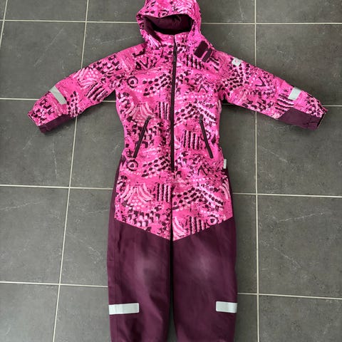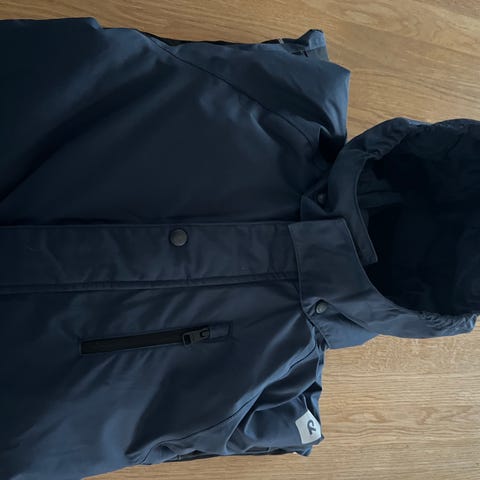 Reima lasten talvihaalari, koko 128, väri sininen. Veden- ja tuulenpitävyyttä. Koiratalous. Jaloissa on kaksi pientä korjatut reiät. Kivissä näkyy ennen ja korjauksen jälkeen.