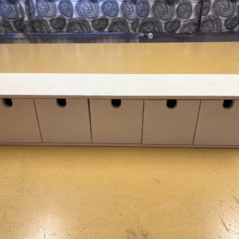 Kätevä ja siisti lokerohylly. Korkeus pyörien kanssa 166 cm. Kahdessa lokerossa taustaseinä, muut avonaisia.