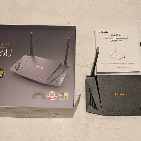 ASUS RP-AC53 Reititin, valkoinen. Laite on varustettu kahdella antennilla ja siinä on pistorasiayhteys. Mallinumero RP-AC53.