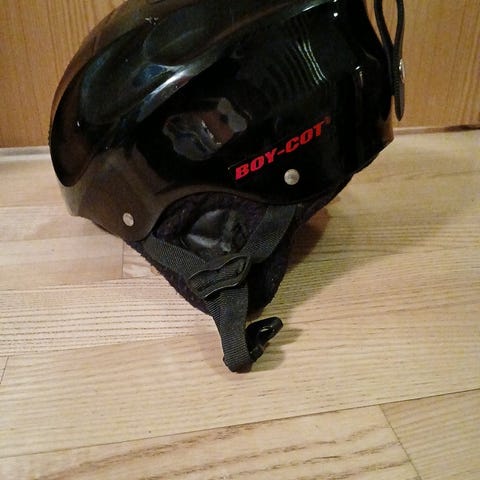 Boy-cot laskettelukypärä koko S/M. Väri vihreä, sisäpehmuste ja säädettävä leukahihna. Kypärässä näkyy käytön jälkiä.