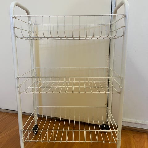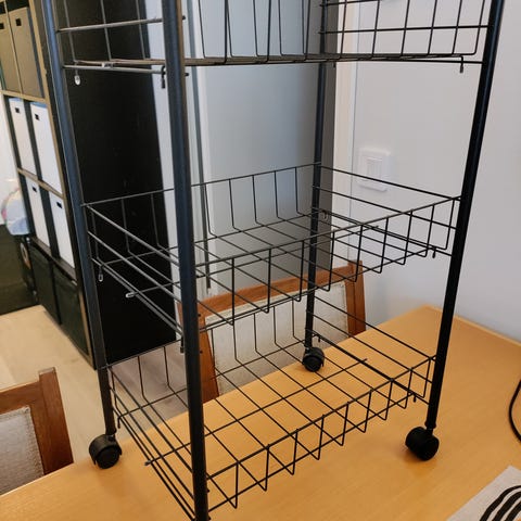 Myydään harmaa korivaunu, jonka korkeus on 62 senttimetriä, pituus 41 senttimetriä ja leveys 23 senttimetriä. Vaunussa on kolme koria. Yksittäisen korin korkeus on noin seitsemän senttimetriä.