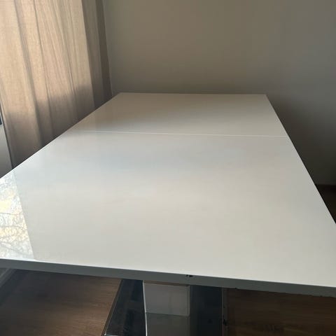 Käytön jälkiä, tuunauksella saa varmasti vielä kelpo pöydän. Tuolien nahkaosat osin kuluneet. Vankat istua, ei huoju.