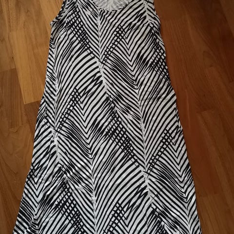 Nanso mekko, koko M, mustavalkoinen, leveys hihojen alta 46 cm, pituus 90 cm, taskut sivussa, 96 % viskoosia, 4 % elastaania, kunto hyvä.