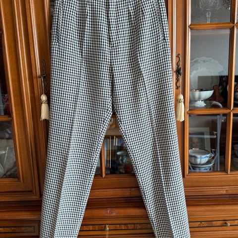 Hyväkuntoiset naisten mustaraitaiset housut. Vintage. Materiaali on villasekoitetta. Kotimaiset. Merkki: Finn Young. Koko: B164/S.
