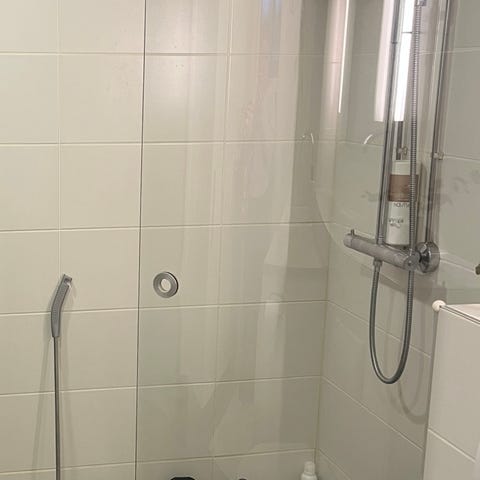 Kääntyvä suihkuseinä, 40 cm leveä kiinteä osa, sarana ja seinään kiinnitettävä osa lisää leveyttä 6-7 cm. Korkeus 192 cm.