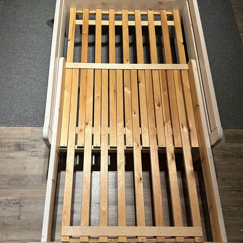 Lasten jatkettava sänky ja hyvä patja. Sänky maalattu joskus ja vähän maalia lähtenyt mutta on kuitenkin hyväkuntoinen. Leveys n.75 cm, pituus 200 cm täyspitkänä.