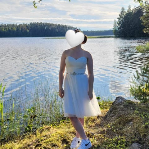 Pieni tahra helmassa, jota ei näe ellei tiedä missä lika on. Likaa ei ole yritetty puhdistaa, varmasti lähtee oikealla puhdistuksella.