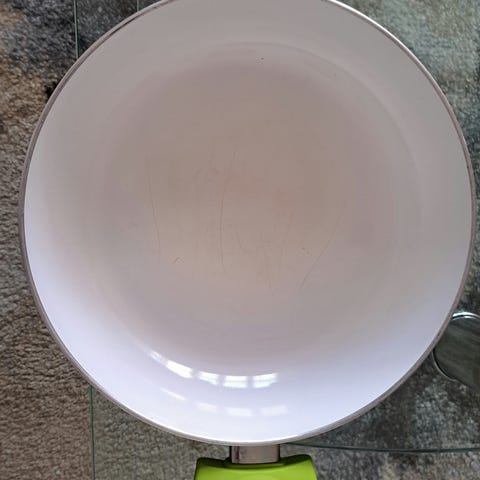 Tätä ei ole taidettu käyttää ollenkaan, mutta säilytyksestä tullut silti naarmuja pannun ulkoreunoihin, jotka eivät toki vaikuta käyttöön millään tapaa. Reunasta reunaan 29cm on pannun mitat.