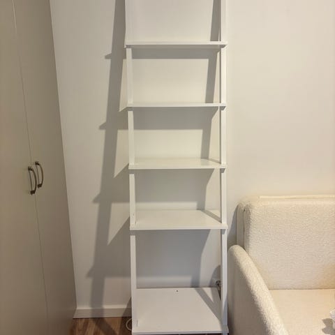 Valkoisella kalkkimaalilla käsitelty tikashylly. Ollut aiemmin musta. Pinnat ovat paikoitellen kuluneet, mutta muuten hylly on ehjä ja hyväkuntoinen. Vain nouto.