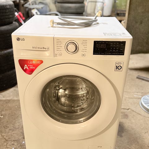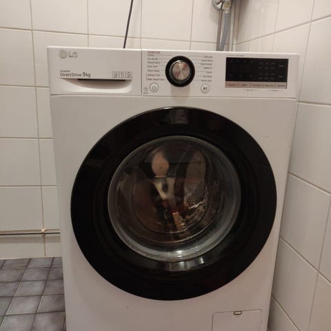 LG edestä täytettävä pesukone, valkoinen väri. Pesukoneessa on useita pesuohjelmia ja digitaalinen näyttö. Sopii kotitalouskäyttöön ja tarjoaa 7 kg:n pesukapasiteetin.