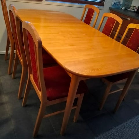 Ruokailuryhmä, joka sisältää 6 puista tuolia, joissa mustat istuinpehmusteet, sekä puisen ruokapöydän. Pöytä ja tuolit ovat vaaleaa puuta. Sopii ruokailutilaan. Jatkopala löytyy.
