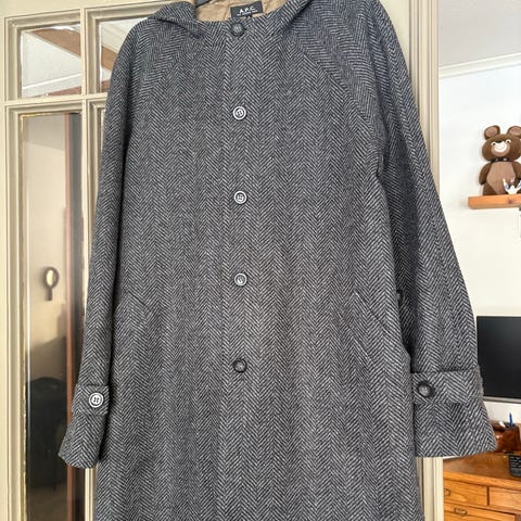 Aivan upea ja laadukas tummanharmaa villakangastakki uuteen kotiin. Pitkä, hiukan A-linjainen malli, tyylikäs ja napakka kaksrivinapitus ylhäällä ja tamppi selässä.
