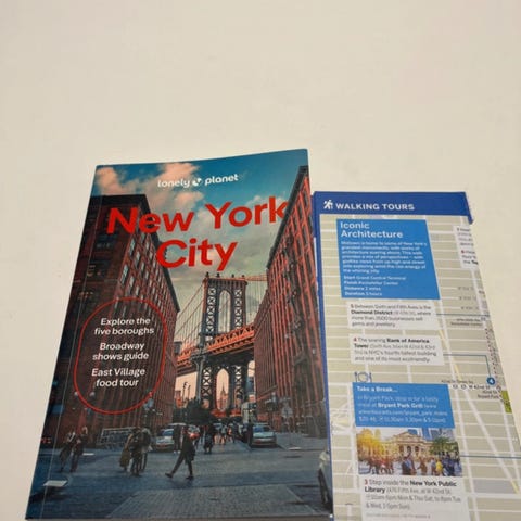 Lonely Planet New York City pocket guide vuodelta 2023. Kirjaa selattu ja kulmat ottaneet osumaa matkustaessa.