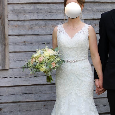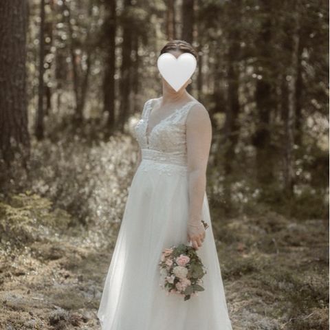 Bianco Eventon Ophelia mallinen puku, johon on muutostöinä rakennettu hihat Bianco Eventolta tilatusta pitsistä ompelijalla. Puku on 2020 ostettu uutena, sillä on menty kerran naimisiin 2021 vuonna, jonka jälkeen säilytetty vaatehuoneessa.