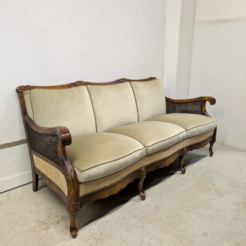 Erikoinen rottinkisohva, jossa puiset jalat ja kädensijat. Ollut katetulla terassilla ja saanut siksi kosteutta. Kunnostamalla saat tästä hienon!