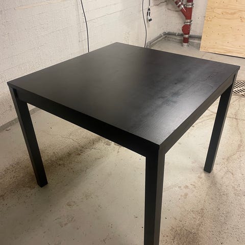 Nordformin tyylikäs musta ruokapöytä, ostettu Ellokselta. Pöytä on siistissä kunnossa ja kestää hyvin kovaakin käyttöä. Pöytälevyn reunoissa on muutama pieni kolhu, jotka näkyvät kuvissa, mutta ne eivät häiritse käyttöä.