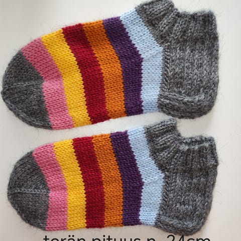 Käyttämättömät villasukat. Keltaisissa hieman reilumpi lesti. Koko vastaa lähinnä 38. Harmaat pituus 21cm ja keltaiset 20cm. Kunto moitteeton. Nouto Saimaanharjulta 10km Lappeenrannasta. Voin postittaa mutta postikulut sinulle