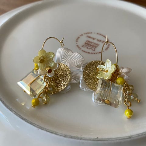 Korvakorut ovat uudet ja käyttämättömät. Korvakorurenkaat kullattu teräs, riipus akryyli, lasihelmi, korumetalli, kirkas, keltainen, kulta.