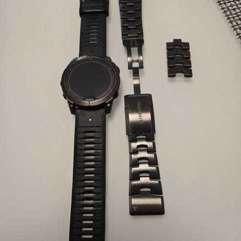 Mukaan garminin alkuperäinen nylon ranneke, sekä teräsranneke. Teräsrannekkeeseen ei ole lisäpaloja. Myös alkuperäinen silikoniranneke josta puuttuu yksi ”pidike”.
