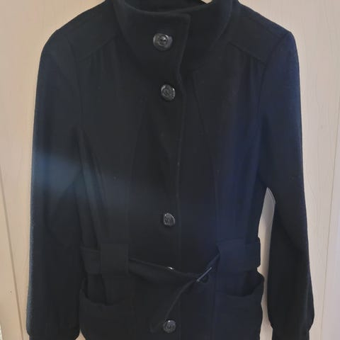 Hyväkuntoinen tukeva villa-polyester kangastakki. Vuori. Topatut olkapäät antaa ryhtiä ja arvokkuutta. Kaksoisnapitus edessä. Isot napit. Isot taskut edessä. Olka-helma 75 cm.