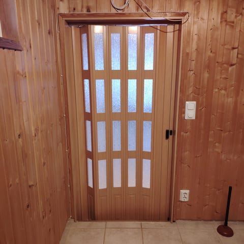 Siisti ja ehjä valkoinen muovinen haitariovi. Ovi kestää sulejttuna magneettien avulla. Aukon koko 80x201.