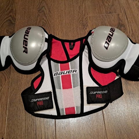 Bauer Supreme Pro jääkiekkosuojat, hartia- ja kyynärsuojat koko Yth M, eli kokolappujen mukaan n. 1-1,25 m pituisille. Polvisuojat koko 8"/ 20 cm, varmaan suunnilleen samalle kokoluokalle sopivat. Hyväkuntoiset.
