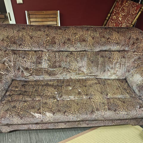 Käytön jälkiä on ja patjaosassa jälkiä,jotka voi halutessaan peittää jollain muulla kankaalla, kuten viimeisessä kuvassa on esimerkkinä. Istuinosan korkeus maasta n. 38cm. Tyynyt ja valkoinen viltti eivät kuulu mukaan