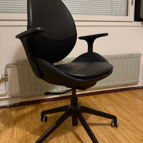 Ikean hyvä ja mukava toimistotuoli. Siistit kankaat. Käsinojiin tullut jostain joitakin naarmuja.