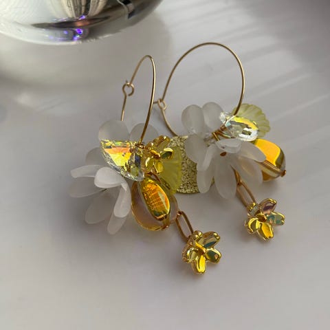 Korvakorut ovat käyttämättömät ja uudet, korvakorurenkaat kullattu teräs, riipus paljetti, lasihelmi, korumetalli, kulta, vihreä, ruskea.
