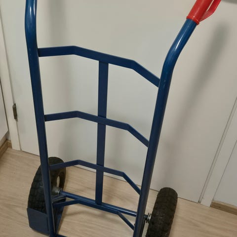 Metallirunkoinen käsikärry oranssina. Sopii tavaroiden kuljettamiseen ja siirtämiseen. Varustettu kahdella pyörällä ja tukevalla alustalla. Voi kääntää myös neljälle pyörälle.